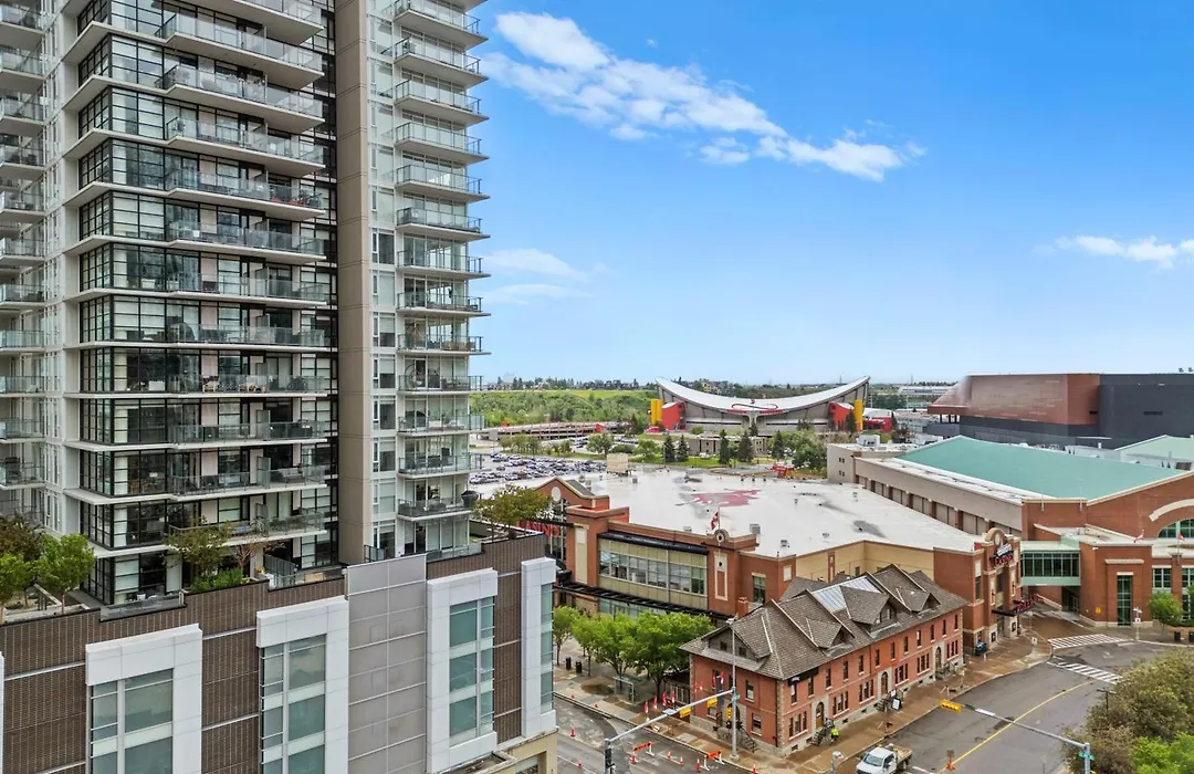 Im Stadtviertel Calgary Stadtzentrum gelegen, bietet die 2-Zimmer- New "The Draper" Luxury Corner Unit & Prime Location Near Stampede Free Parking Banff Pass & Wine eine Terrasse mit Blick auf die Stadt.